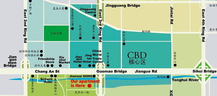 Facing south, 65 square meters, located in the south-west of Guomao Bridge, 5 minutes' walk to the East 3rd Ring Road, 10 minutes' walk to Jianwai Soho, Metro 10 Shuangjing Station or Metro 7 Guangqumenwai Station. 13th of 14-storey, wooden floor, modern-decorated, fully furnished with IKEA furniture, TV set, refrigerator, washing machine, air-conditioner and water heater. Internet and 24-hour elevator available. Easy shopping and eating-out with lots of supermarkets, 24-hours mini marts, groceries, restaurants, bars, banks, bakeries, pharmacies and laundries around.
