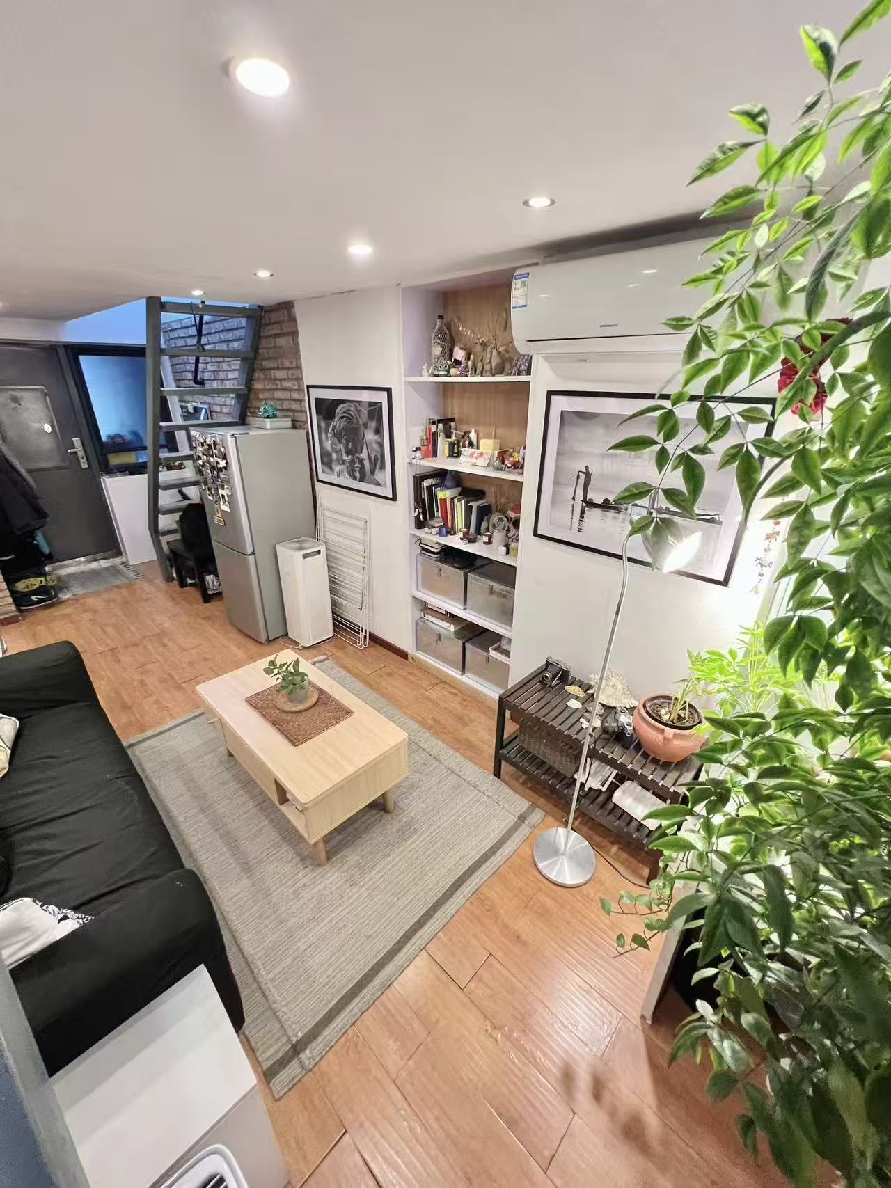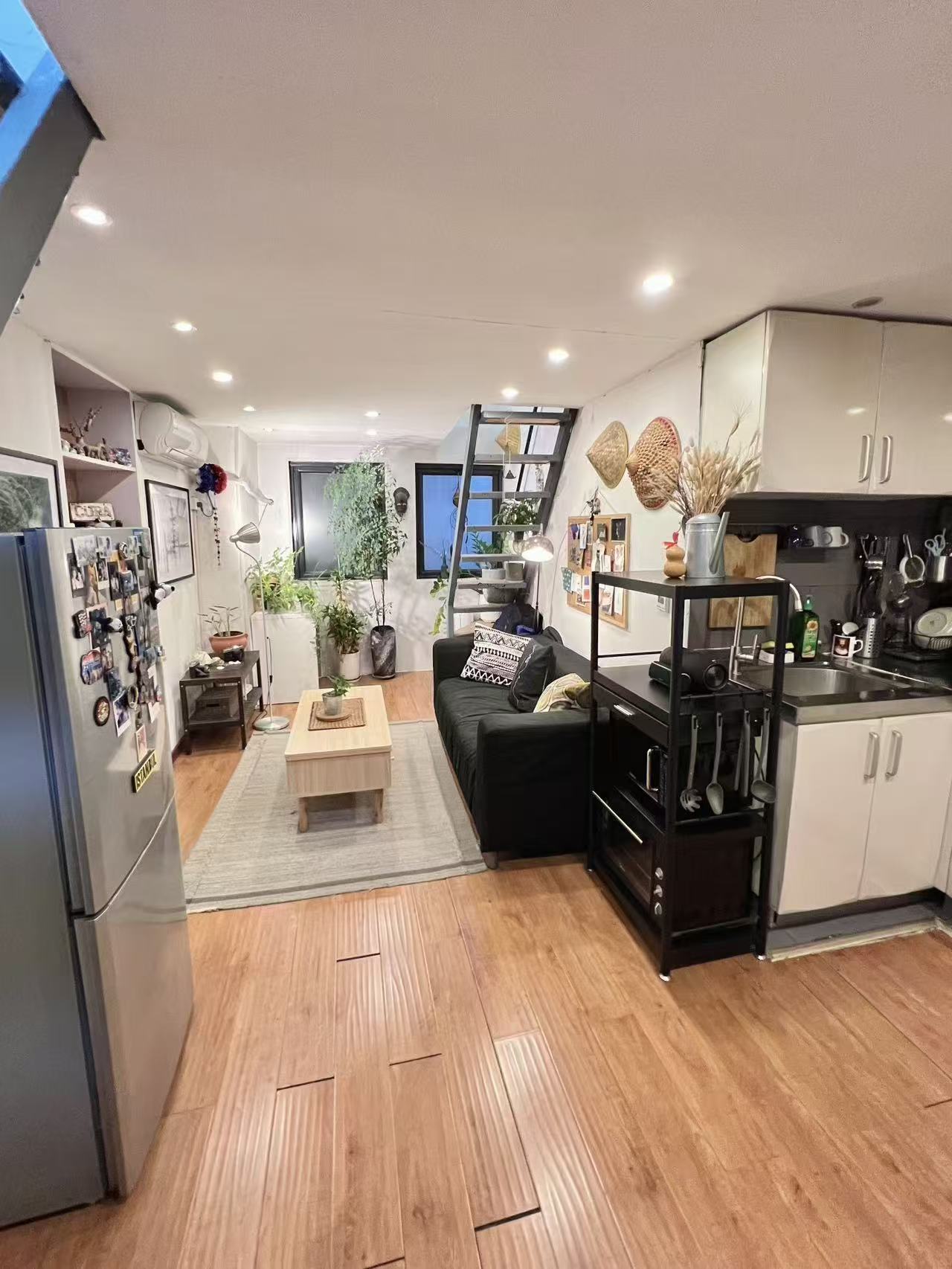 It has 2 stairs and 1bedroom,with one study room, one bathroom, living room is cozy, open kitchen and built in wardrobe, shape is squre so feel comfortable. Next to supermarket and north 2nd ring road, easy go out getting taxi or bus. subway is 15 minutes by walk dongzhimen exit A. Skylight over the kitchen the living room windows are everywhere.