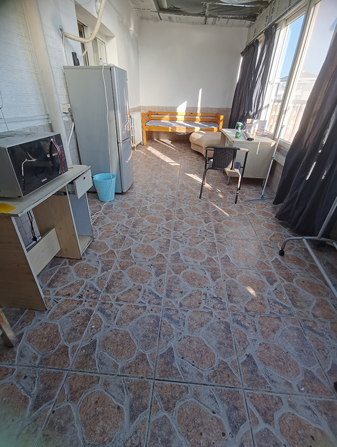 Room size 60m2 inclusive 30m2 window enclosed balcony for rest. well equipped with fridge, microwave,, washing machine, heating system, and well equipped with furniture of sofa, bed, desk, rack..... with water leads and drain supply with in room. and solar heating shower equipped.